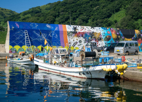 島民や観光客のみなさんに愛着を持ってもらえたら、僕の作品も長くこの島に溶け込んでいけるんじゃないかな。そのために、やれることはやりまくった1か月ですから(笑)。近くで見ても遠くからでも、どこから見てもそれぞれ見えてくるものがある。朝や夕方、雨の日雪の日など、見る日によって『こんなモチーフがあったんだ、いたんだ』と景色は変わってくる。荒れた日にも、何か明るい気持ちになってもらえる絵であれば、僕も嬉しいですね」
